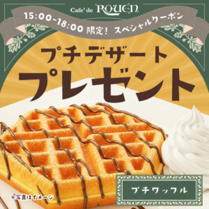 毎日15時から18時限定でお使いいただけるプチデザートプレゼントクーポンのお知らせです