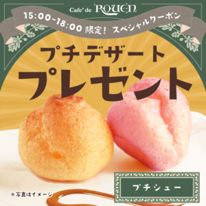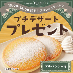 15時から18時限定でお使いいただけるプチデザートプレゼントクーポンをご用意しました。
